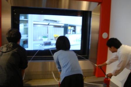 また、他にも体験できるコーナーがあり、火災時、大きな声で火災を知らせるために90デシベル以上声を出し、消火器を使って消火する体験や、煙を吸わないように濡れたハンカチを口に当て、煙は上昇するので出来るだけ身体を低くして煙の部屋から逃げる体験をしました。