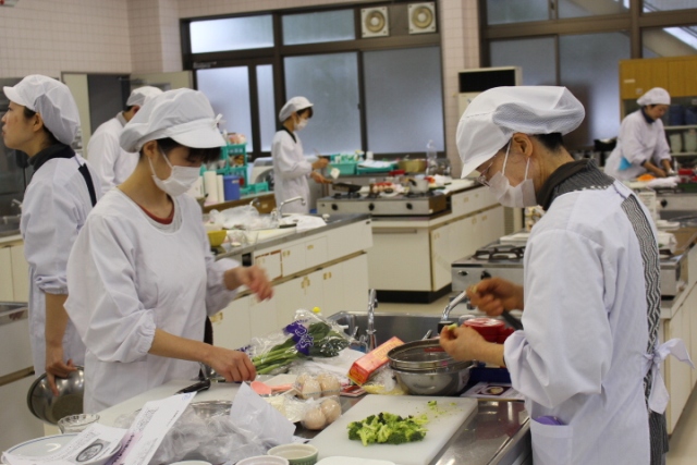 市立日新中学校との中大連携授業である「スーパー食育スクール(SSS)事業」のレシピ集作成に関わる調理実習を行いました。今年で3年目になり、SSS事業も最終年となります。集大成になるようなレシピ集の作成に向け、学生たちは各自担当する献立(4品)に緊張しつつ取り組みました。2年間の調理実習の成果が十分に発揮できた一日でした。